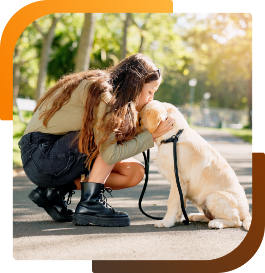 In a sunlit park, a woman crouches down to gently hold her golden retriever’s face, sharing a calm and affectionate moment. The dog sits patiently on a leash while the woman leans in close, conveying care, reassurance, and trust. Trees and soft natural light in the background create a warm, peaceful outdoor atmosphere, highlighting the bond between the woman and her dog.