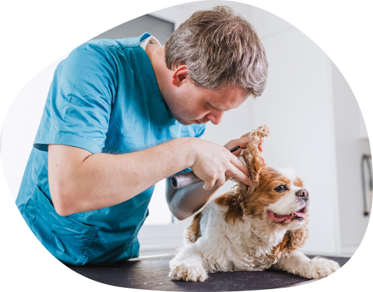 A professional dog groomer focuses on trimming the ear of a small, long-haired dog positioned on a grooming table indoors. The groomer uses electric clippers with precision while gently holding the dog’s ear to ensure comfort and safety. The dog appears calm and alert, with its tongue slightly out, suggesting a relaxed grooming environment. The clean, bright setting highlights proper pet care and professional grooming practice.